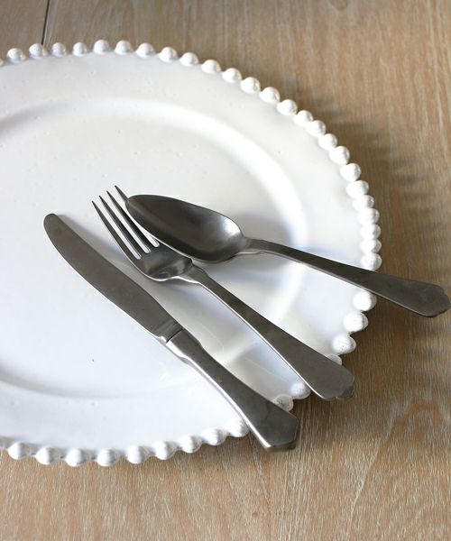 表面を研磨加工したブラックストーンシリーズ。 お子様など手の小さな方はこちらをディナー用に使って頂いても。 ディナーサイズよりも小ぶりですが、非常に使いやすい大きさです。 ナイフ・スプーン・フォークをそれぞれお選び頂けます。 汚れが付きにくく、滑りの良い表面なのでお手入れも簡単。 よく見ると、ところどころ細かな模様が見える新しくて上品な質感です。 カトラリーといえば銀色のイメージを持つかもしれませんが 都会的でとてもオシャレな逸品です。 暗い灰色といった感じで、ソリッドな質感はカジュアルな場面でも。 ウッドプレートやカフェ風のインテリアなどに合わせたり、 また和食器にもピッタリです。 しっかりと重量感のある素材でかっこよく、 どんなコーディネートにも合わせやすくて重宝します。 スプーンやフォークに比べ、ナイフは柄に厚みがあり、 握りやすく設計されているもの嬉しい心遣いを感じます。 ラインや角度が美しいフォルムを作り出しています。 ストーンシリーズはチタン加工されており、食器洗い機対応。 とても強く固く、傷がつきにくいので普段使いして頂けます。 毎日のお食事も優雅に過ごせそうですね。 スモーキーな色合いが手作りの優しい表情のアスティエを スタイリッシュに演出します。