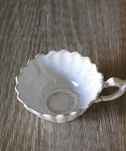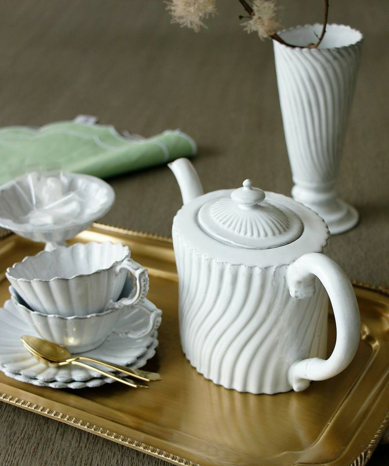 クラッシックをベースにデコラな装飾、綺麗な白の塗り、鉄色の素材… 洗練された存在感です。薄くて軽く、丈夫なので日常使いにも最適です。食洗機にも対応しています。