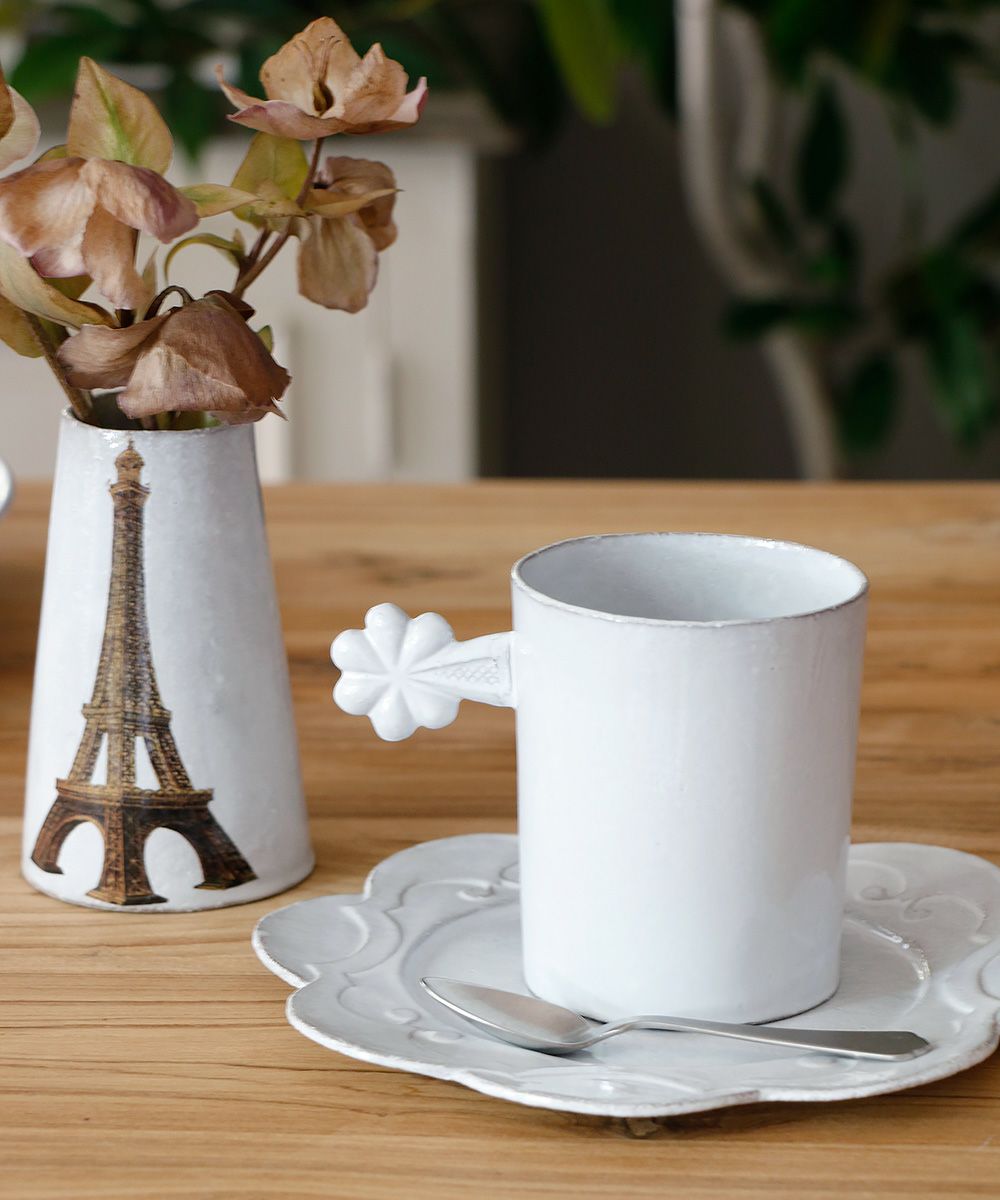 クラッシックをベースにデコラな装飾、綺麗な白の塗り、鉄色の素材… 洗練された存在感です。薄くて軽く、丈夫なので日常使いにも最適です。食洗機にも対応しています。
