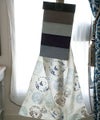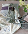 模様はブルー系とグレージュで、プリントと刺繍が施されています。